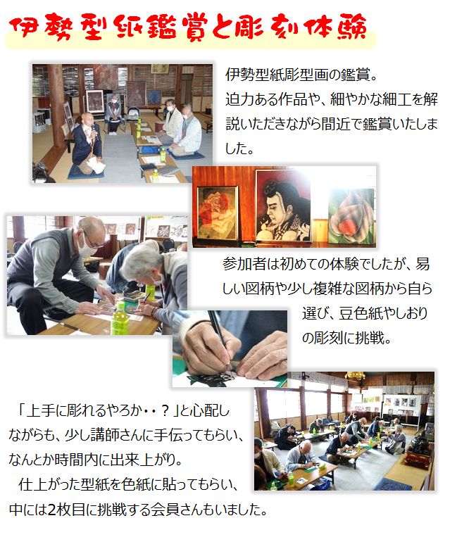 今年は流行禍の状況から集団での移動、会食などに危惧の念がもたれ、移動および食事なしの研修を考え、お勤め、仏事のイロハに続き、横山(功)さんを講師に今回は伊勢型紙彫型画の鑑賞と体験を企画。